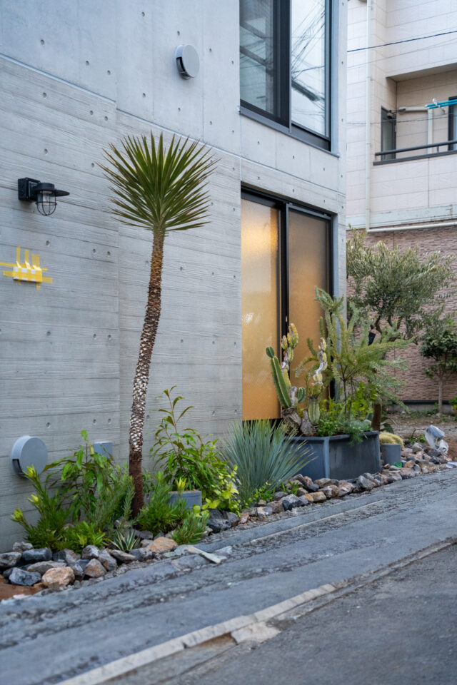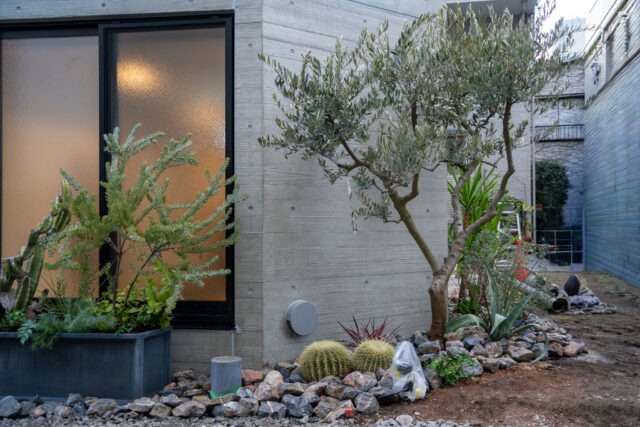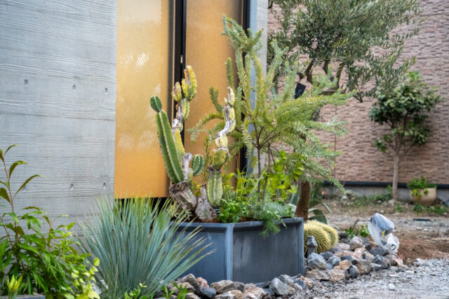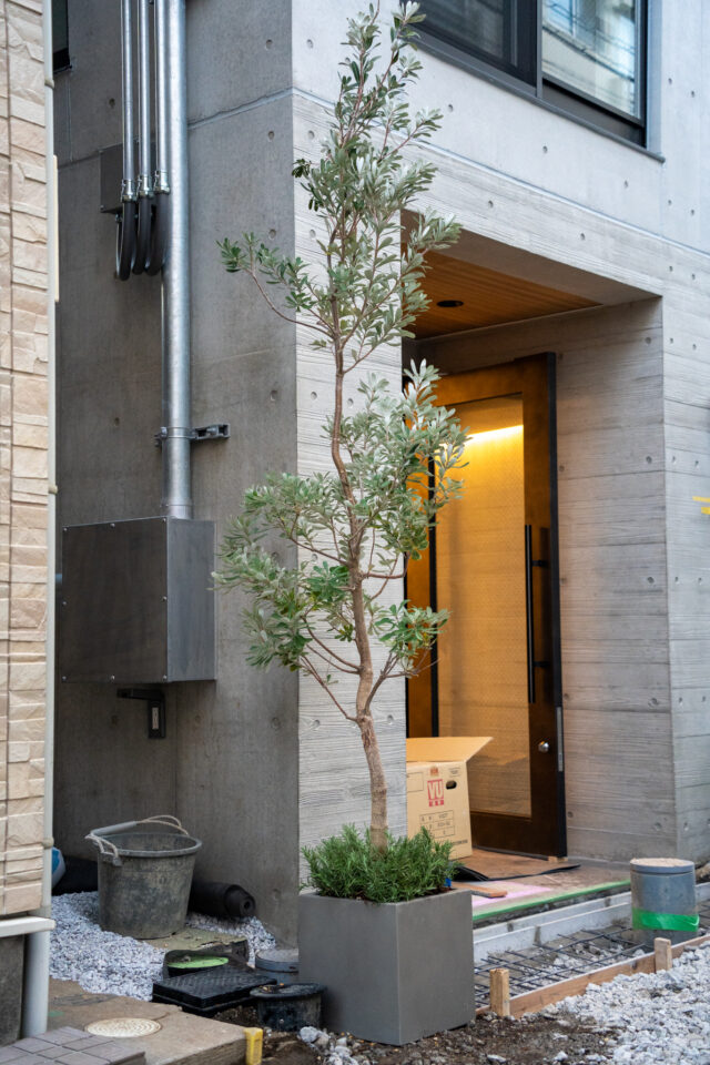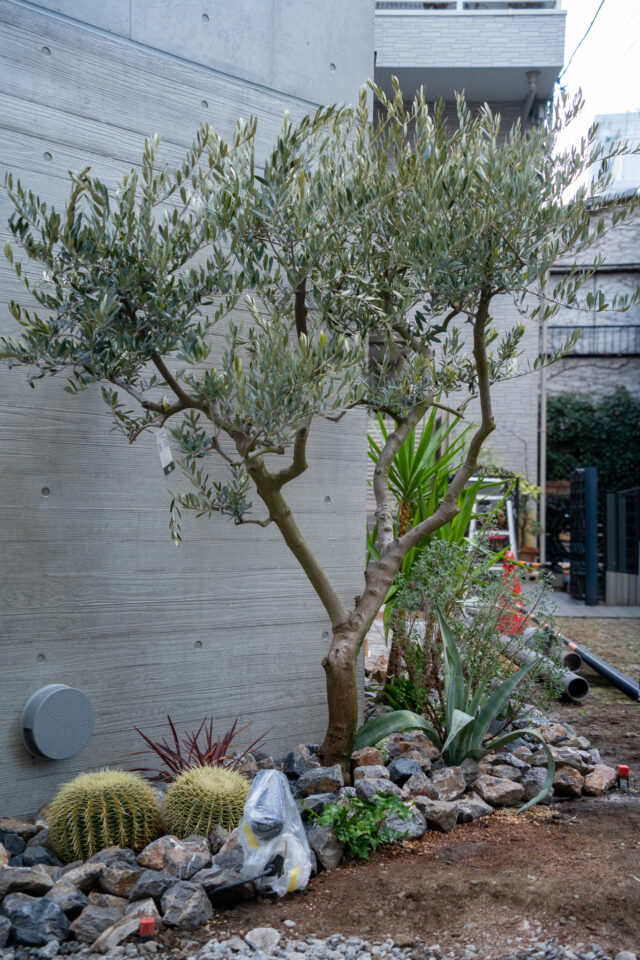 国産・香川県産オリーブを取り入れ、反対側は印象に残る植栽構成