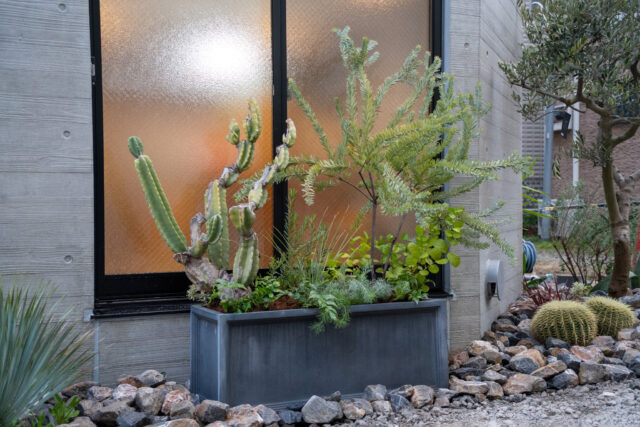 鉢植えを組み合わせ、奥行きの少ない空間に立体感を演出